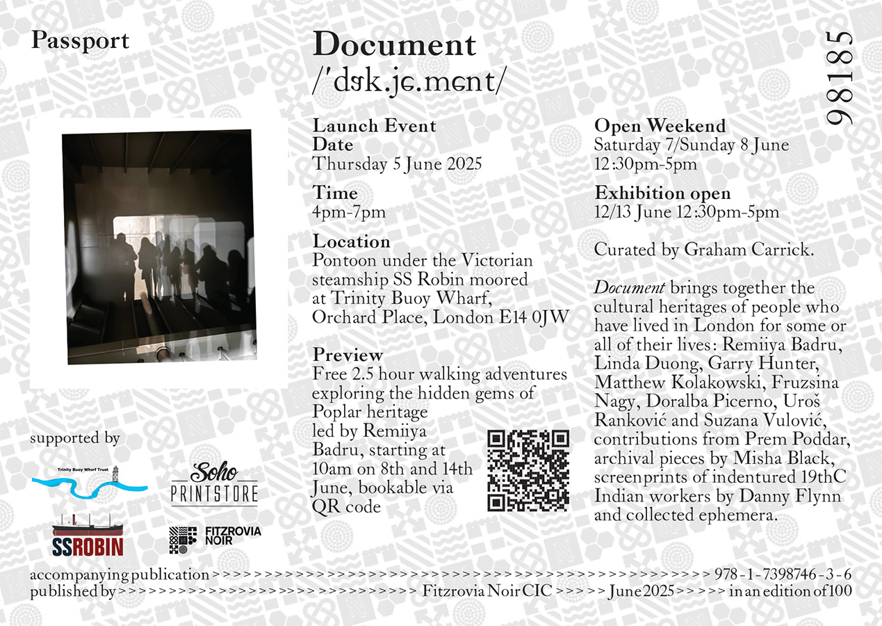 Document brings together the cultural heritages of people who have lived in London for some or all of their lives Remiiya Badru, Linda Duong, Danny Flynn, Garry Hunter, Matthew Kolakowski, Fruzsina Nagy, Doralba Picerno, Uroš Ranković and Suzana Vulović with contributions from Prem Poddar archival pieces by Misha Black and collected ephemera.