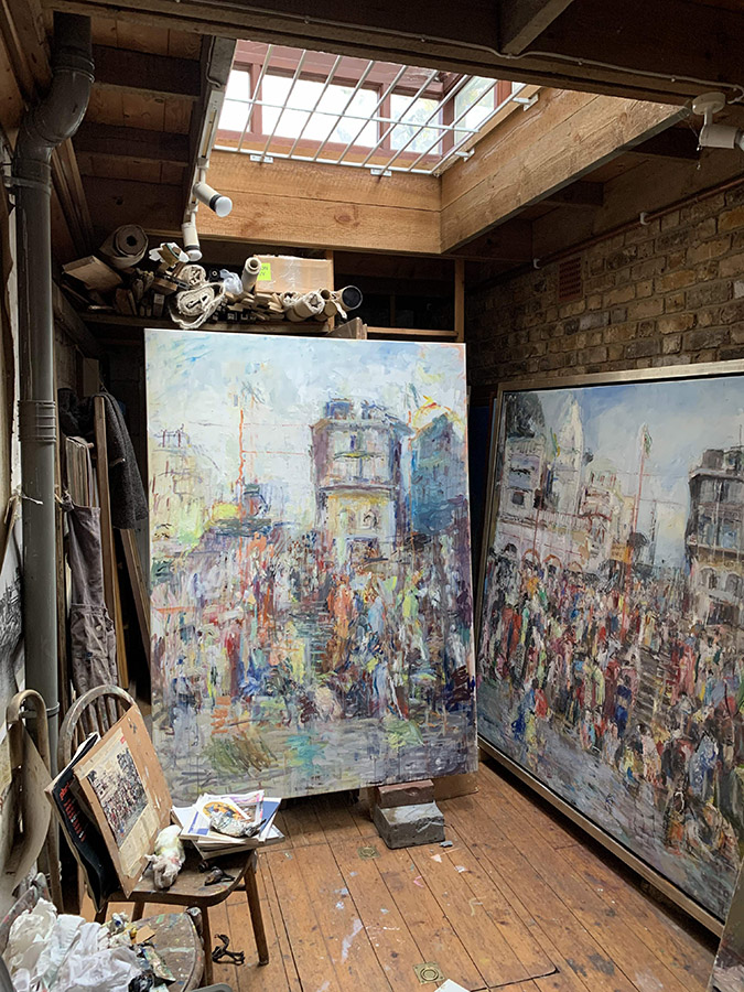 AE. I had a carer come and he said “You’re 20 years old.” And in a sense, I am 20 years old, because I’m much more alive now to what’s going on in the world. Whereas I was pretty bigoted about 40 years ago. When I was totally kind of Euston Road. I think now I’m much more open to new ideas. I’m seething with ideas, really, which are not necessarily painting out of the window or doing the oak tree at the end of the garden. This is time, to paint people en-masse, Indian pictures, bodies piling up, Listening to marches. I mean It’s slightly more political than I ever would have thought of before…