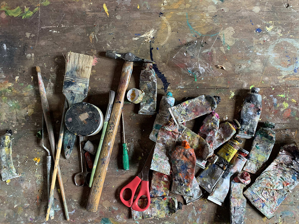 We meet in Tony’s Brixton house where the ground floor is now his combined studios and living space. His pneumatic bed shares space with his canvases and paints, trays of medications alongside piles of open books and papers. He makes coffee, we get comfortable and talk.