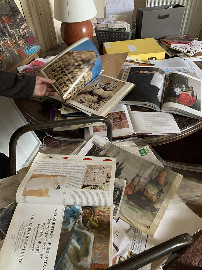 AE. Yes, it’s got my reactions to the lockdown and it’s accompanied by very fresh and rather marvellous photographs of my pictures and with me working on them. Her photographs are Velasquez-like. Very good in themselves. A father and daughter can work together and make something out of the not very good. One of these chaotic things we’ve been talking about. Do you see a connection? I mean, to use the positivity coming out of the lockdown. I think it’s illustrating a lot of what we’ve been talking about.