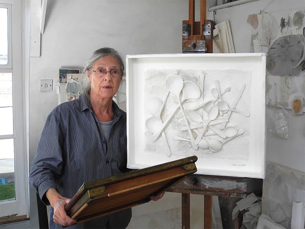 I’m interested in exploring the environment we create for ourselves. The objects we choose and use that reflect our thoughts and lives. Most of my work is absorbed from life or I make drawings and sometimes use photographs. Other images are memorised or imaginary. I also use embossing and printmaking techniques. Underlying my work is an abstract vocabulary though the figurative image is foremost. The making process is an integral part of my work. It can take a long time. It materialises my thoughts and ideas.