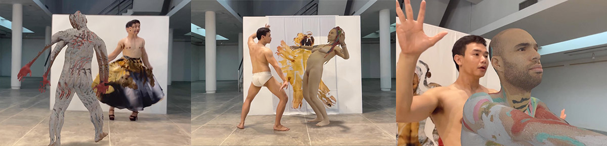 A month earlier, I had held a “Sleeve Emporium” event at the Sonics Immersive Media Lab at Goldsmiths University. This had involved the audience invoking the AR version of the people whose sleeves were projected onto the video walls by scanning a QR code and witnessing lifesize 3D versions appearing in front of them. My mind had been distilling this ever since and so I started some experimental workshops with Golf, to explore how we as physical humans might engage and interact with digital humans as our existence becomes more hybrid. Each session developed the thinking and how we staged the tech. This led to filming an event called Invocation at Chiang Mai University Arts Centre, which was pivotal.