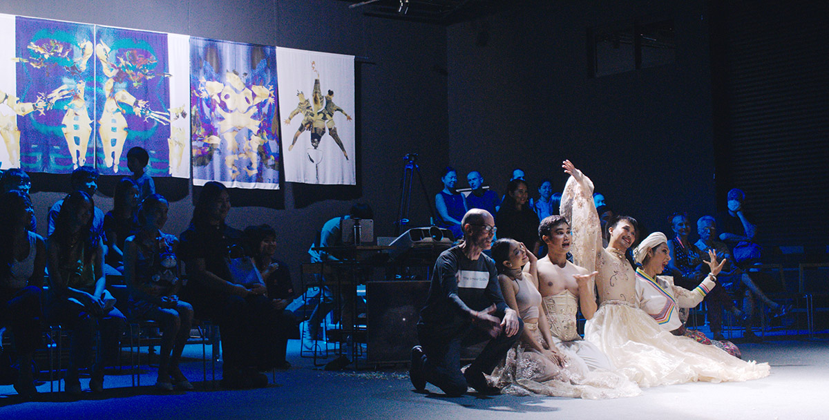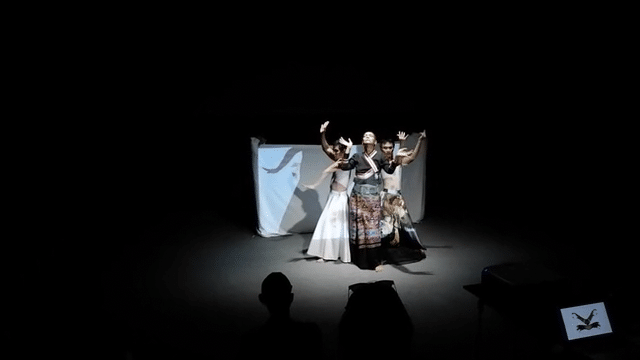 And then I had to contend with the challenges of working in a live theatre for the first time. Slotting our rehearsals between other productions and availability of dancers meant that it wasn’t until 2pm on the opening day, that we were able to bring together the fabric scrollers, two dancers, Sade and final lighting/sound setup. Nevertheless, the doors opened at 5pm, and we started with a bi-lingual double-act between Aom and myself to give a “director’s” introduction to the performance Incarnation.