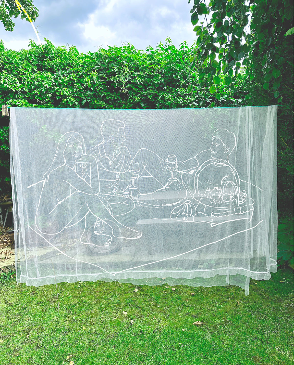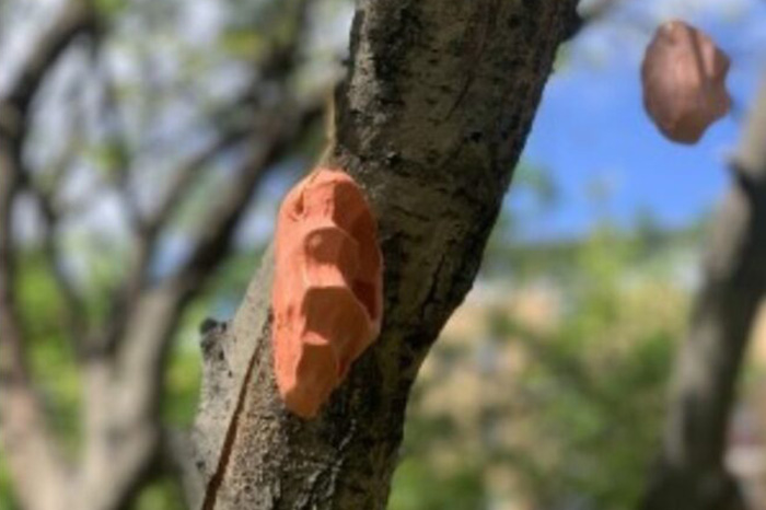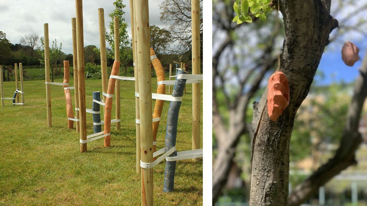The London Group have distilled this into the theme ‘Landscapes’, which the exhibiting artists have interrogated from different perspectives and in different mediums. These include traditional, poetic, emotional and urban to name but a few. Barbara Beyer’s installation ‘Best intentions’ references young urban trees strapped between poles to support their early years growth. They need this support as they are taken out of their natural environment and the whole contraption reveals our ambiguous relation to landscape and environment. Marenka Gabeler explores the landscape of emotions with a series of small sculptures that are to hang from branches or be placed among the trunk and branches of a tree. The pieces are imprints of the negative shapes her hands make when feeling intense emotions.