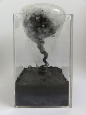 I draw on the pictorial aspects of science; its graphics and models. They appear in my drawings, but mutated, smudged and overlapped. My constructions are pseudo-experiments or models of arrested action. A suspended shooting star or a volcano in a jar become safely contained miniature events.
