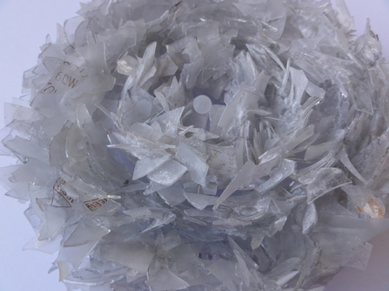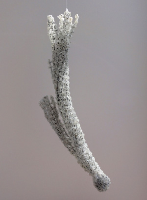 The works are on a domestic scale and delicate, reducing the massive subject matter to intimate mementos. With accretions of small elements I mimic the processes of the natural world. I use commonplace materials; wire-wool, salt, broken light-bulbs.
