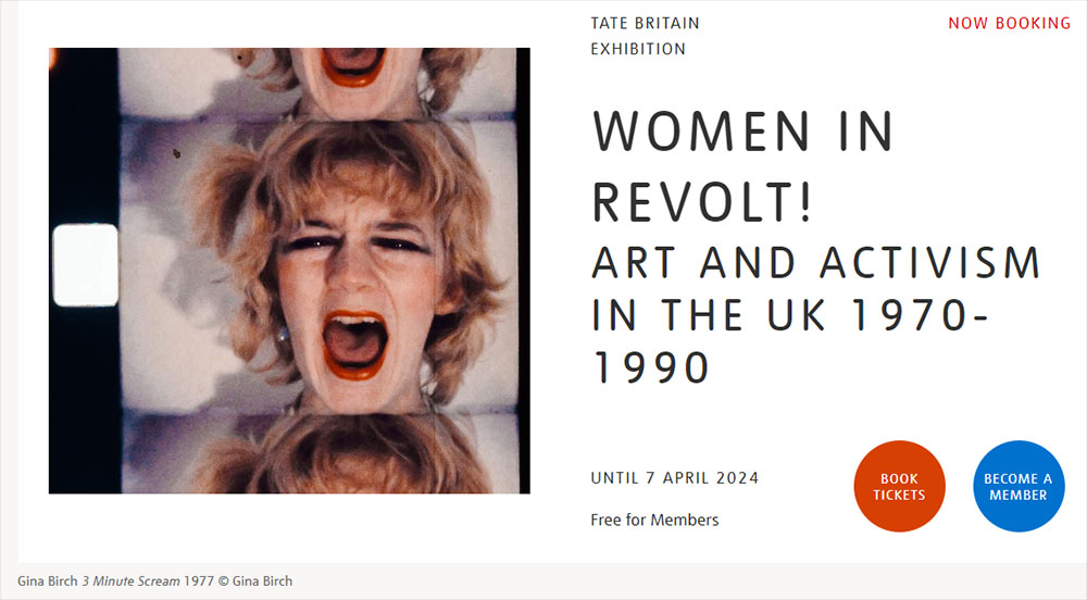 – Women In Revolt! Art and Activism in the UK 1970-1990. Tate Britain, London, until 7 April 2024. It will then transfer to National Galleries Scotland: Modern, Edinburgh, 25 May 2024 to 26 January 2025 and the Whitworth Art Gallery, Manchester, 7 March to 1 June 2025