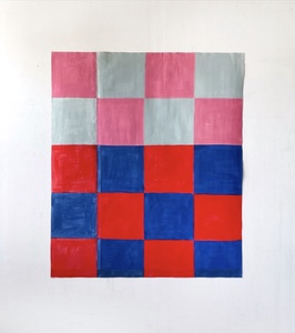 The reductive conventions of geometric abstraction are well over a century old now and, despite the much-repeated ‘death of painting’ narrative, remain an endlessly mutable source for the making of paintings. The exploration of a non-hierarchical visual language through colour, shape, rhythm, surface, figure/ground relationships and scale, along with the grid used as a structuring device constitute key elements of these conventions. Rosalind Krauss’s seminal essay, Grids, states, ‘The physical qualities of the surface, we could say, are mapped onto the aesthetic dimensions of the same surface.’ (3)