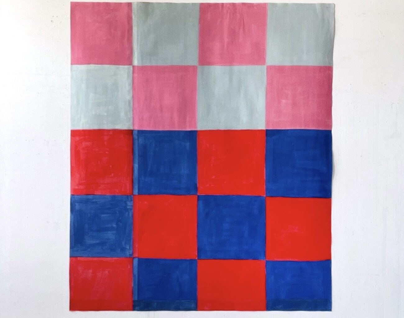 The reductive conventions of geometric abstraction are well over a century old now and, despite the much-repeated ‘death of painting’ narrative, remain an endlessly mutable source for the making of paintings. The exploration of a non-hierarchical visual language through colour, shape, rhythm, surface, figure/ground relationships and scale, along with the grid used as a structuring device constitute key elements of these conventions. Rosalind Krauss’s seminal essay, Grids, states, ‘The physical qualities of the surface, we could say, are mapped onto the aesthetic dimensions of the same surface.’ (3)