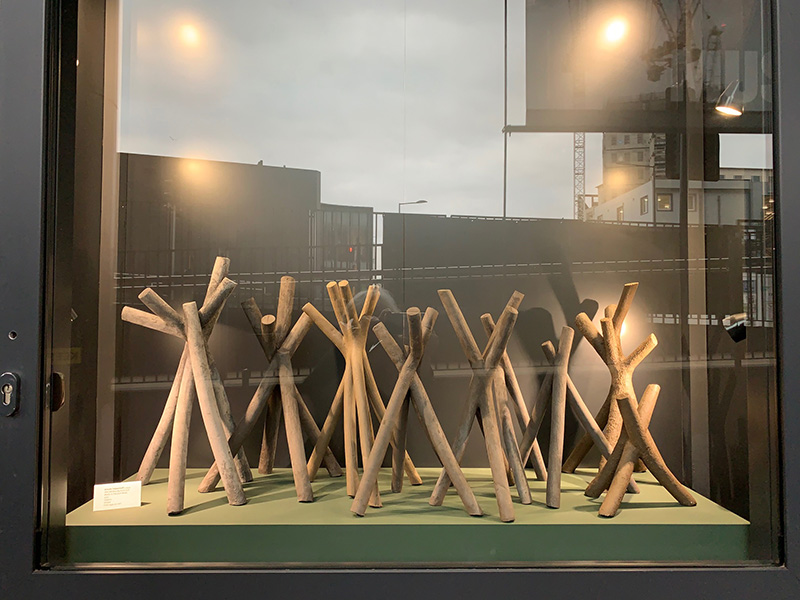 I have constructed minimal landscapes and populated them with ceramic pieces most of which were made during lockdown when I had plenty of time to think and reflect. The small clay cubes, ‘Indensities’, in Window 1 acquired human qualities during the process of hollowing them out and revealing their innards. As soon as I grouped them together in little huddles they started to relate to each other. They are very tactile little pieces and when they are not on display I carry some around with me in my pockets.